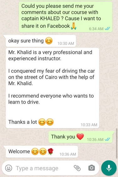 كان عندى رهبه وتخوف شديد من السواقه .. انما مع كابتن خالد واكاديميه العالمى فهما فعلا اسم على مسمى وبشكرهم على سرعه الاستجابه وحسن التعامل